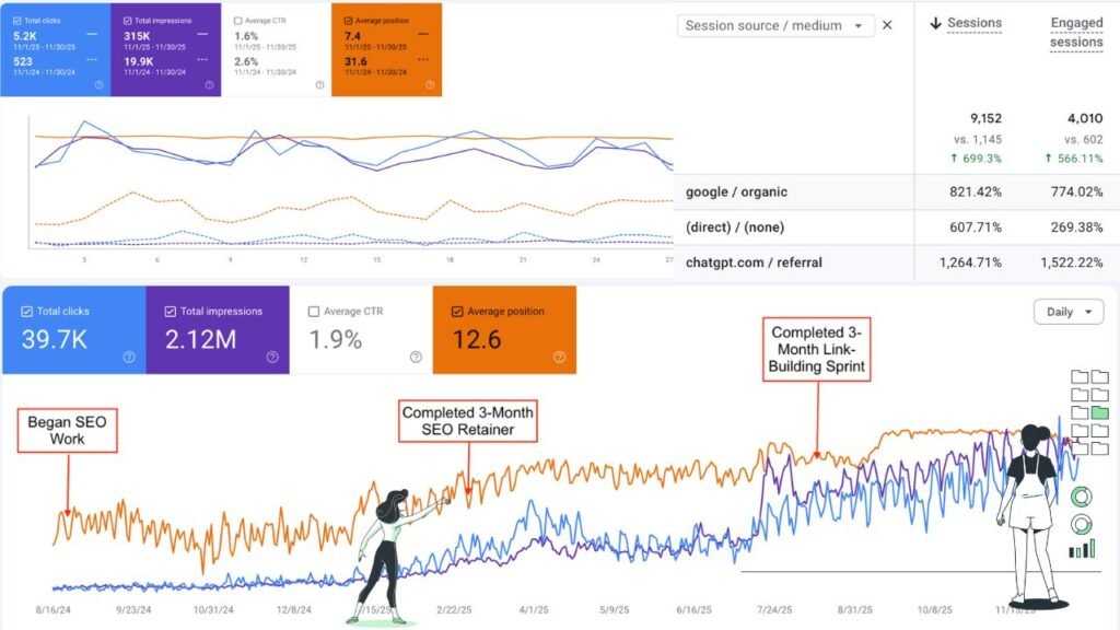 The site’s organic traffic increased from 523 clicks in November 2024 to 5.200 clicks in November 2025.