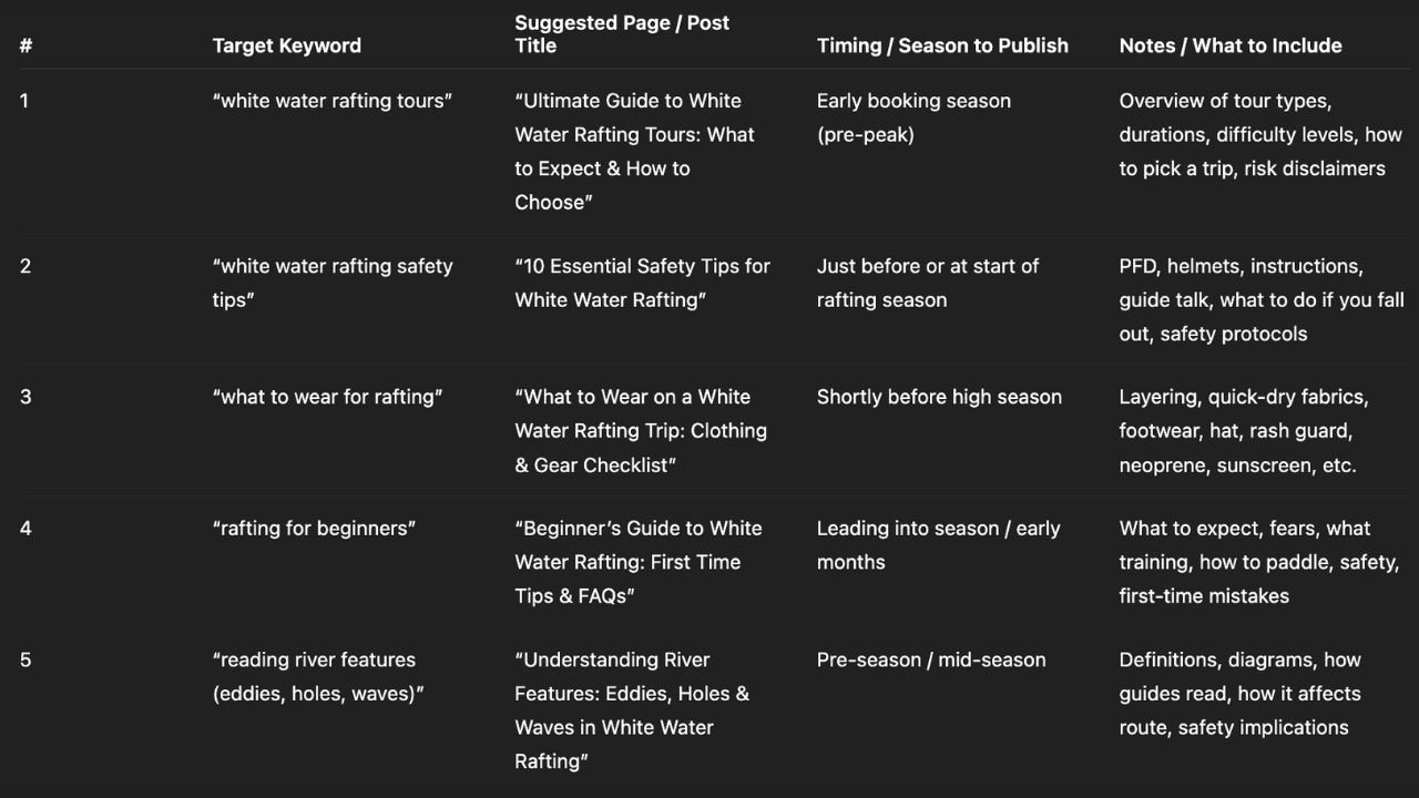 Effective SEO for adventure tour guides also relies on keyword research and a clear content plan. Here are a few ways to find relevant travel keywords for your tour business: