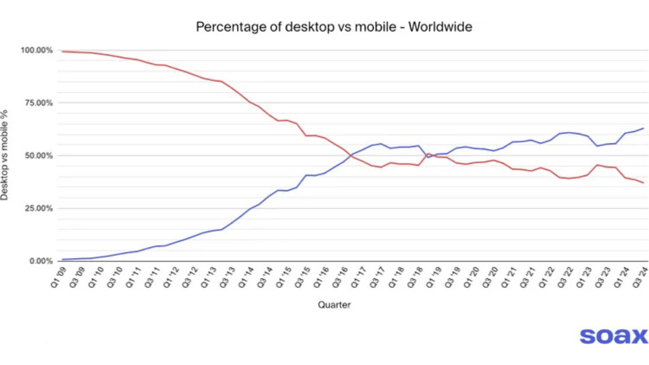 According to recent research, nearly 65% of all web traffic comes from mobile devices. In 2017, mobile traffic overtook desktop for the first time and has since continued to grow, despite a brief dip in 2019. Today, more than two-thirds of global traffic comes from mobile, and this trend is expected to continue rising.