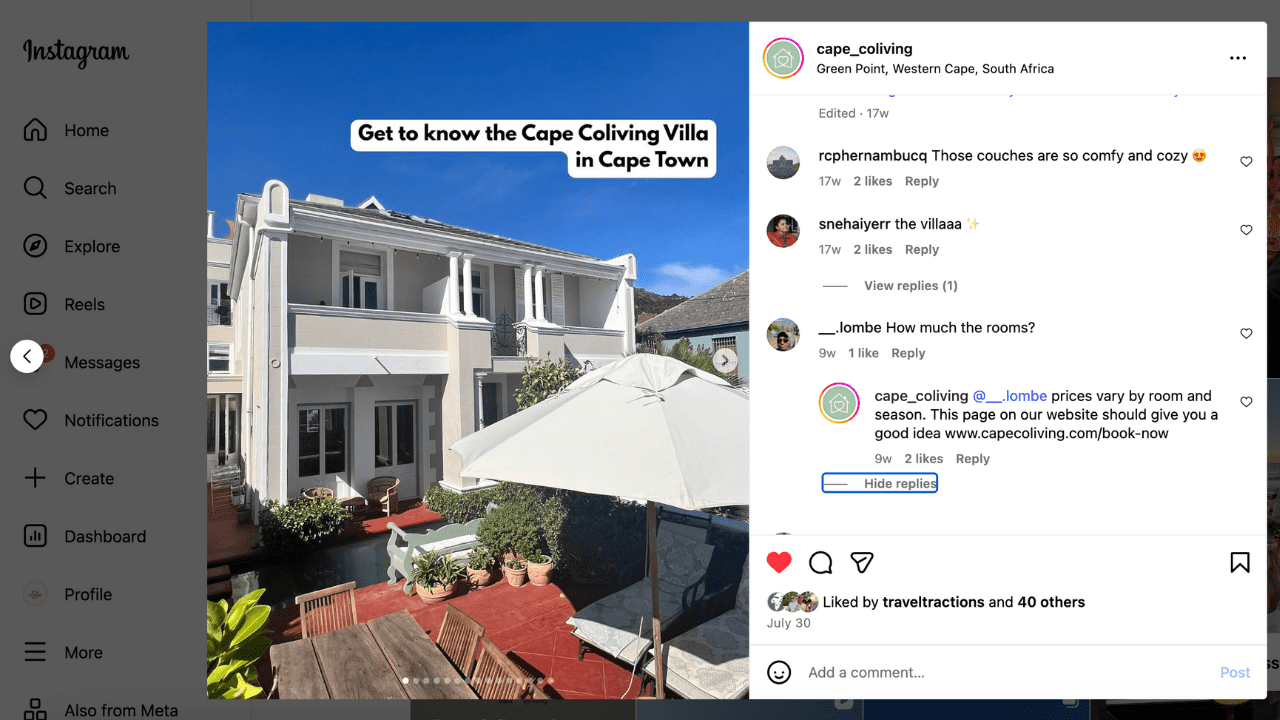 Fostering a community around your travel business has many benefits. A few that stand out include increased brand awareness, trust building, instant feedback, lead generation, and brainstorming for future content. Use polls, Q&As, and giveaways to keep the conversation engaging.