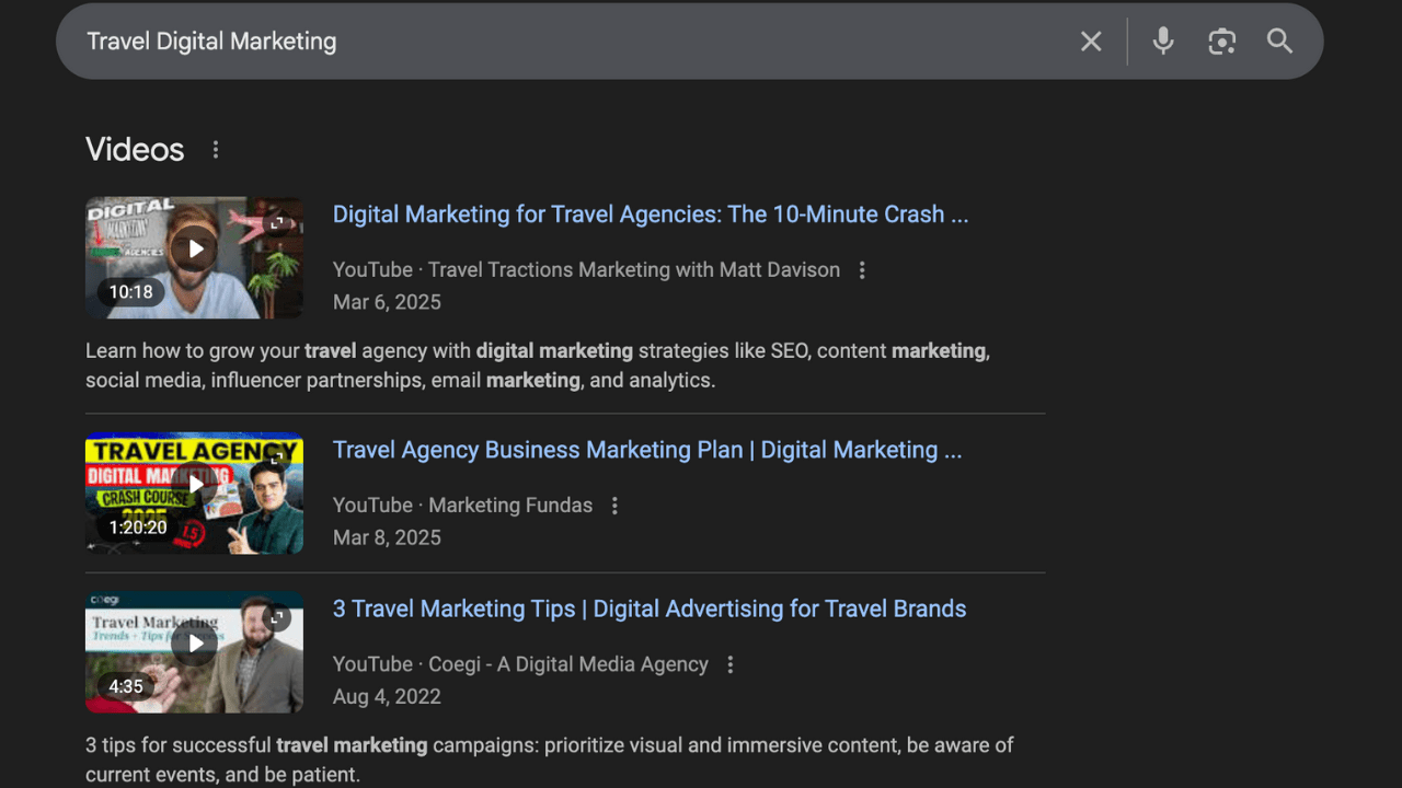 (Screenshot of the video search results for “travel digital marketing)