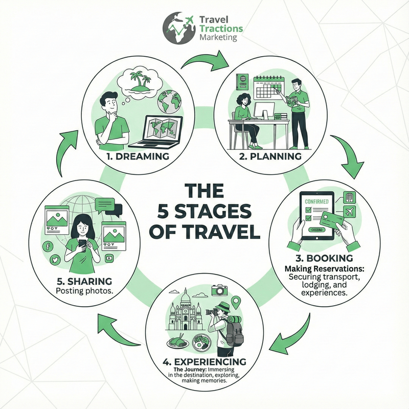 This alignment of intent and content is best visualized through the 5 Stages of Travel. Rather than a linear path, modern travel is a cyclical journey where your SEO strategy must meet the traveler at every distinct phase.